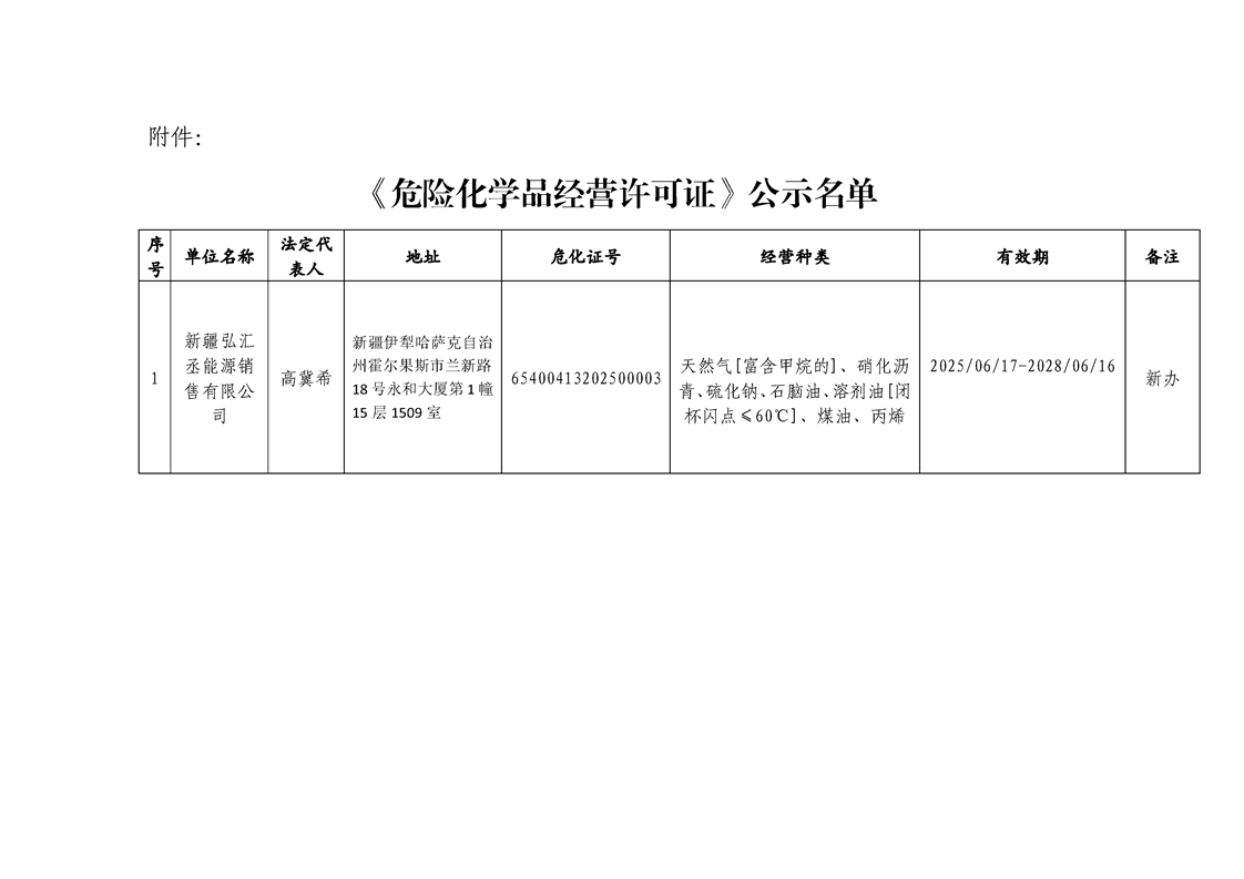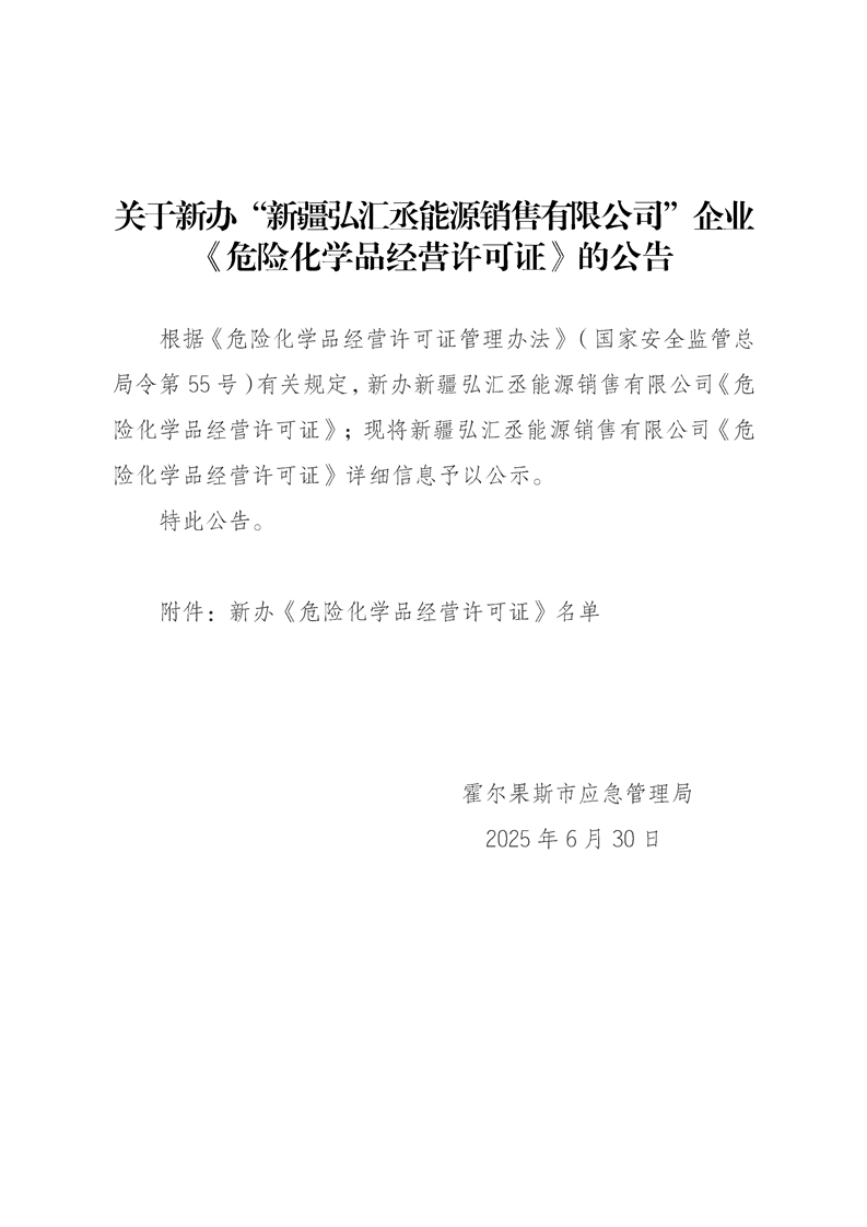 关于新办“新疆弘汇丞能源销售有限公司”企业《危险化学品经营许可证》的公告