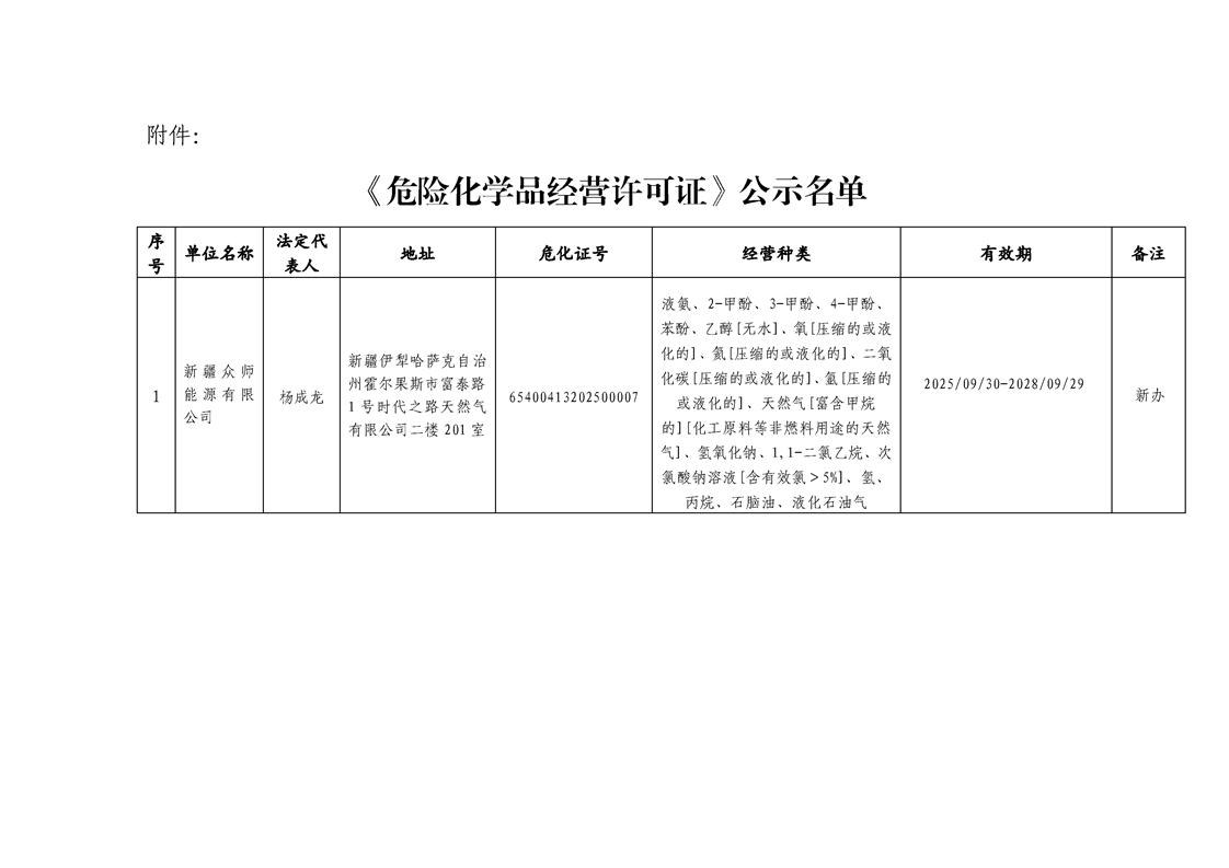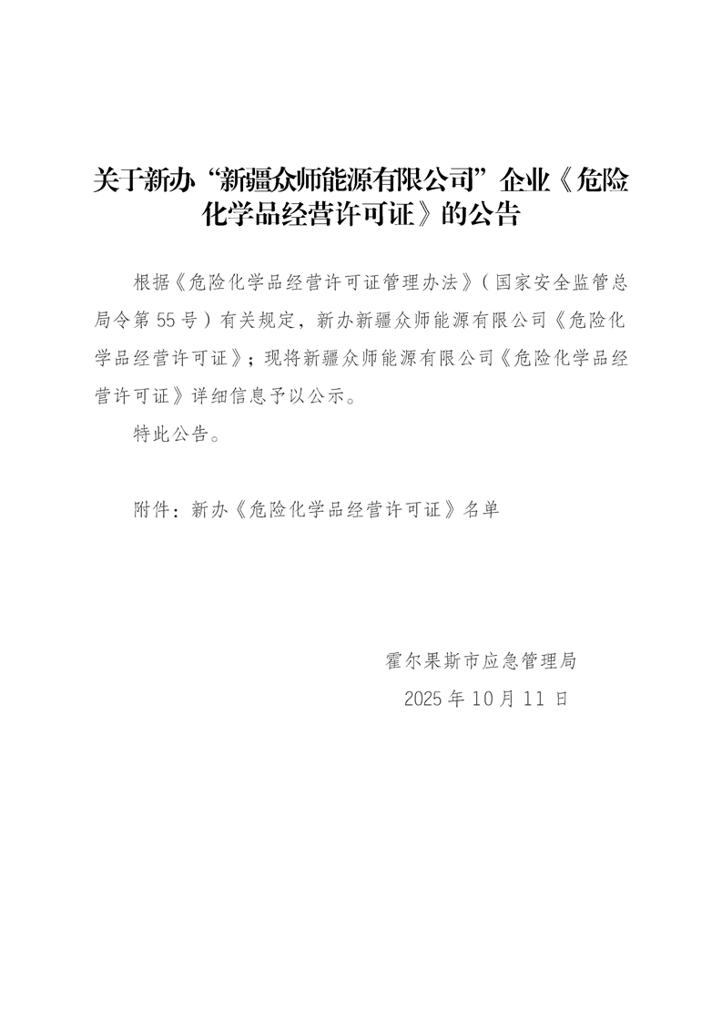 关于新办“新疆众师能源有限公司”企业《危险化学品经营许可证》的公告