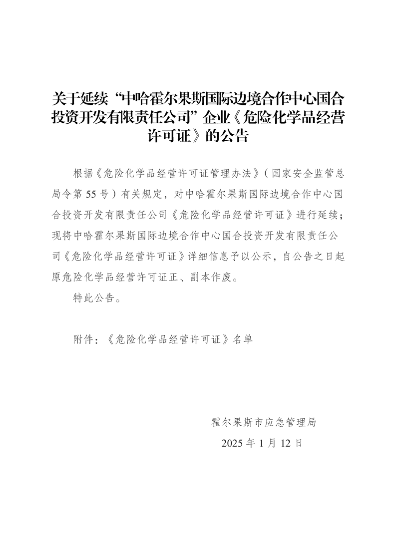 关于延续“中哈霍尔果斯国际边境合作中心国合投资开发有限责任公司”企业《危险化学品经营许可证》的公告
