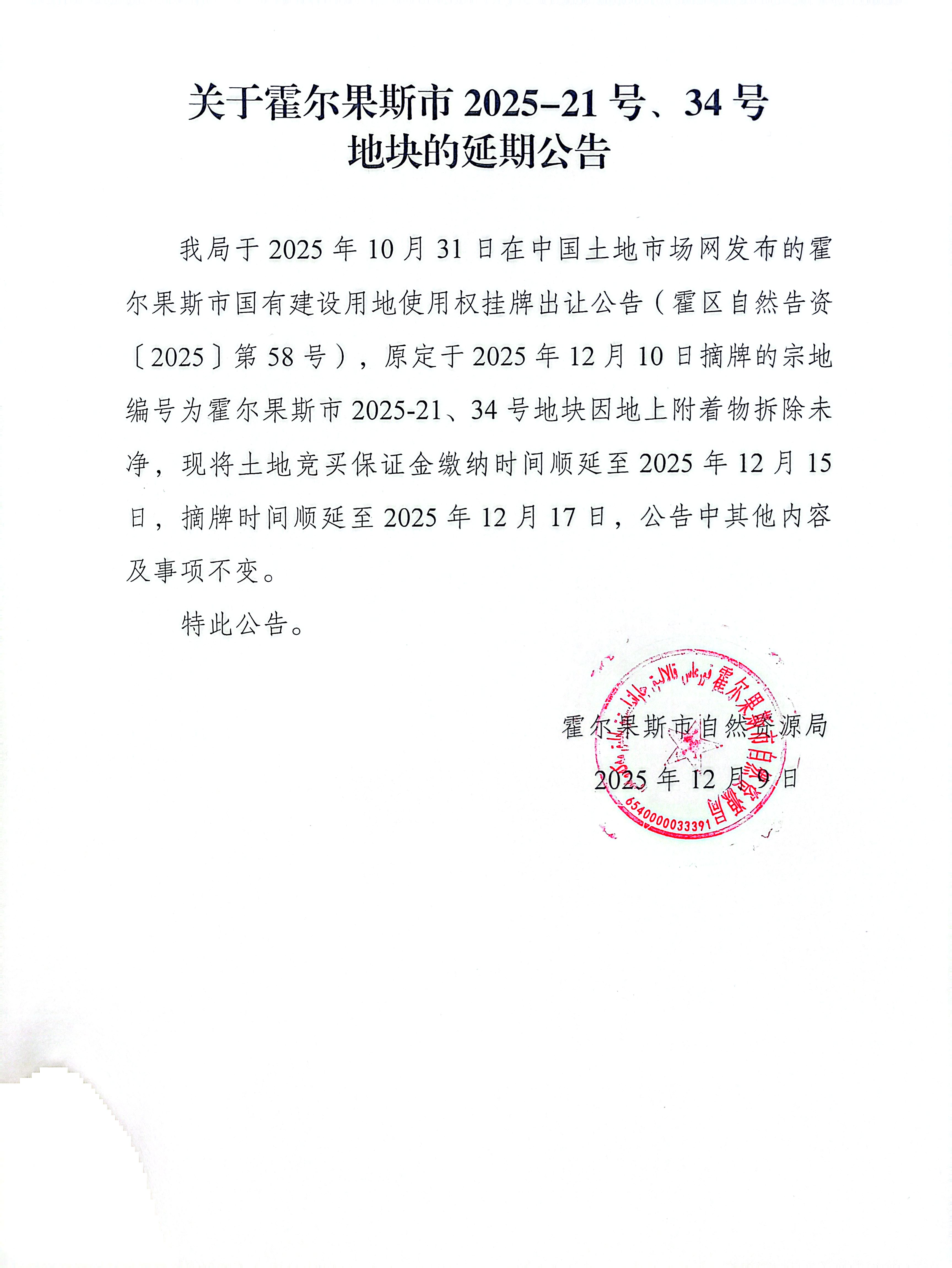 关于霍尔果斯市2025-21号、34号地块的延期公告