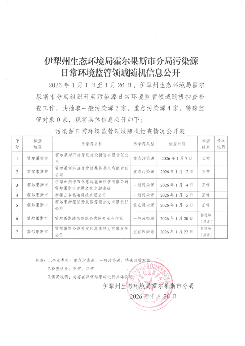 关于《伊犁州生态环境局霍尔果斯市分局污染源日常环境监管领域随机信息公开》的公示(一月份)