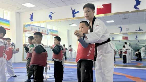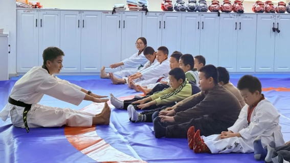 课堂上,跆拳道教学现场活力满满。专业教练从基础姿势入手,手把手指导孩子们练习拳法、腿法和格挡动作,耐心纠正每一个细节。孩子们身着统一道服,精神抖擞、神情专注,一招一式刚劲有力,在反复练习中锻炼体魄,更培养了坚韧不拔、奋勇争先的优良品质。