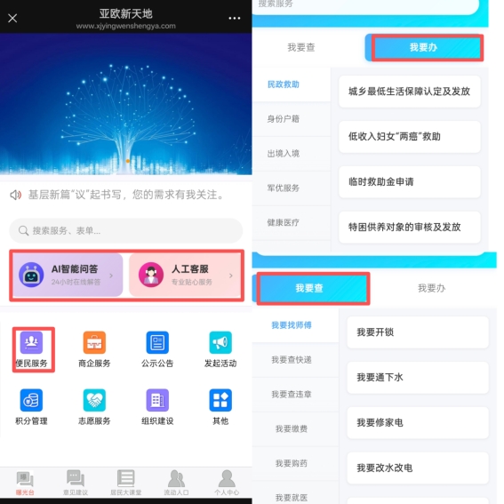 针对居民办事流程繁琐、来回跑腿等痛点,卡拉苏社区聚焦“便捷化”,在智慧社区平台重点打造“我要查”“我要办”两大核心服务体系,整合水电气缴费、快递物流追踪等民生高频事项,构建一站式线上服务窗口。居民无需出门,点开智慧社区平台即可办理各类业务,界面简洁、操作简便,兼顾年轻人与老年人使用需求,实现“人人会操作、事事能办理”。