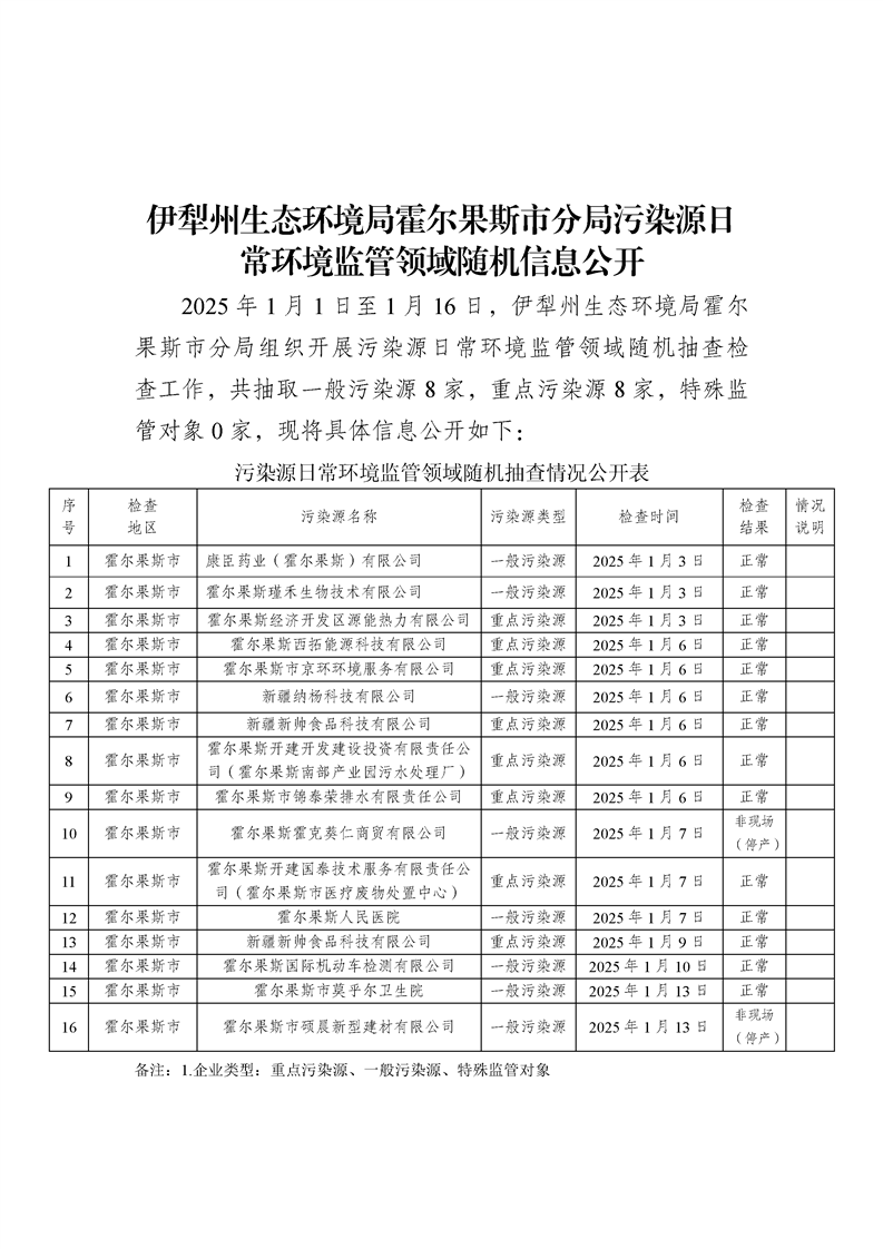 伊犁州生态环境局霍尔果斯市分局污染源日常环境监管领域随机信息公开2025年1月