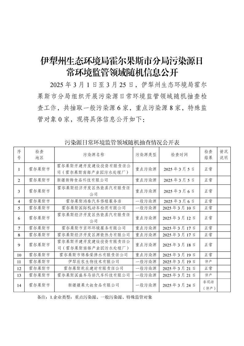 污染源日常环境监管领域随机信息公开3月份