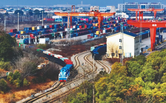 >>2月2日,一列满载大理石制品、棉布、墙纸等货物的中欧班列从南昌国际陆港出发,由霍尔果斯口岸出境,途经哈萨克斯坦,经里海运输至阿塞拜疆首都巴库。视觉中国供图