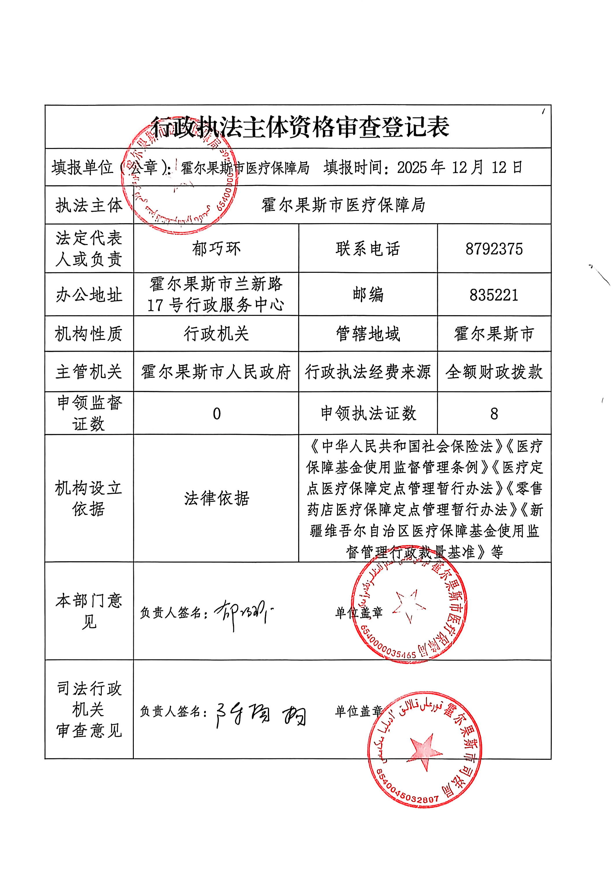 霍尔果斯市医疗保障局行政执法主体资格审查登记表
